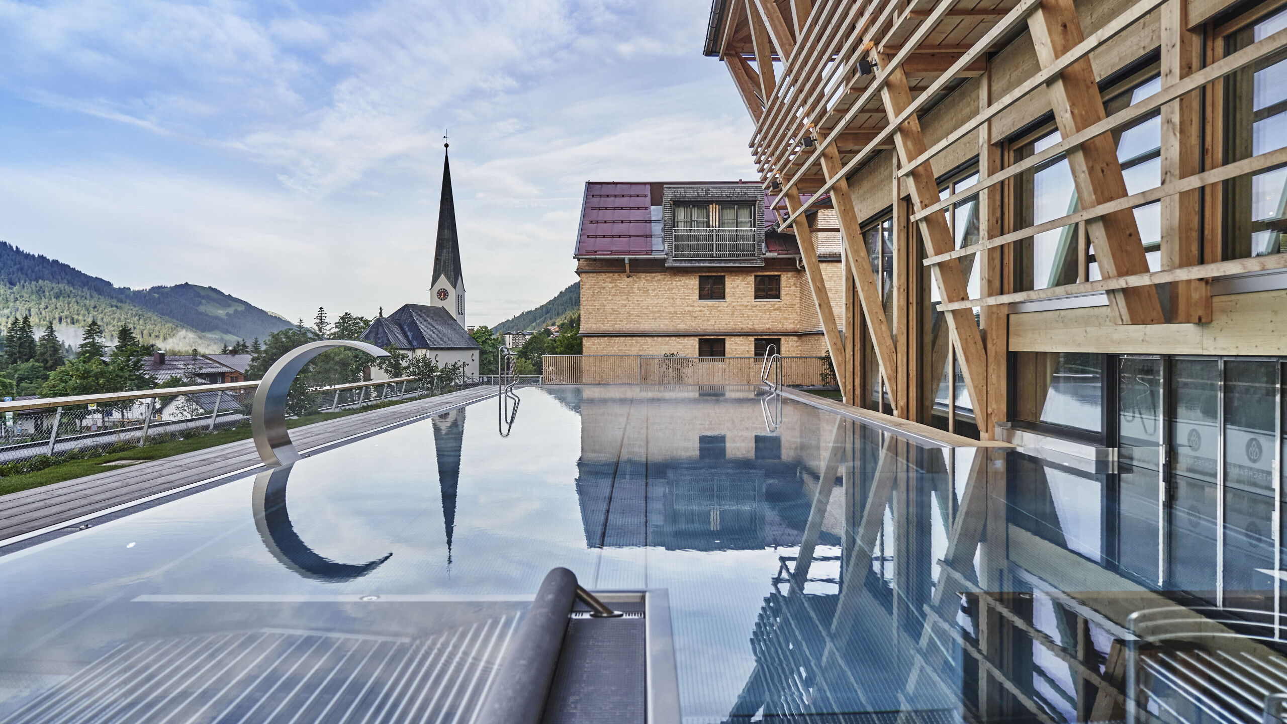Wasser ist Leben. Es fließt. Es reinigt. Es trägt. Unser Infinity-Pool mit traumhaftem Blick in die Allgäuer Bergwelt ist mehr als ein Schwimmbecken. Er ist eine Grenze. Zwischen Himmel und Erde. Wer hier eintaucht, lässt die Schwere am Beckenrand zurück. Das Wasser trägt Sie. Gemeinsam. Blick in die Weite. Die Berge spiegeln sich. Außen und Innen verschwimmen.