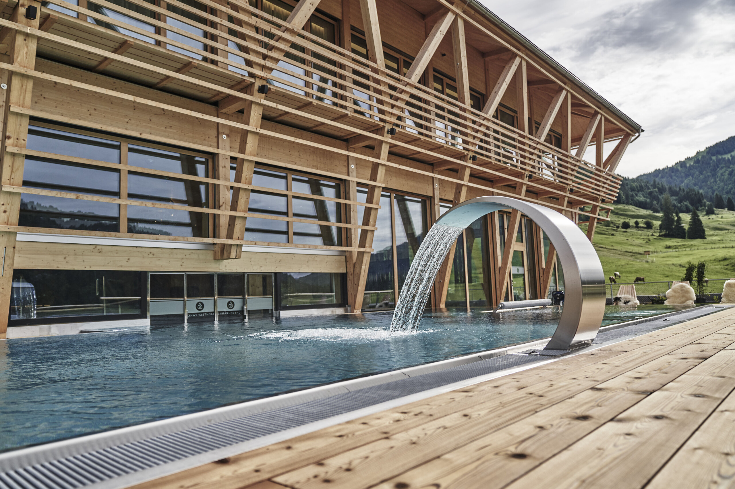 Der Infinity-Pool. Das Wasser scheint direkt in die Allgäuer Bergwelt zu fließen. Ein traumhafter Blick. Keine Grenze zwischen dem gemachten Raum und der ewigen Natur. Schwerelosigkeit. Der Körper verliert an Gewicht. Der Geist an Schwere.